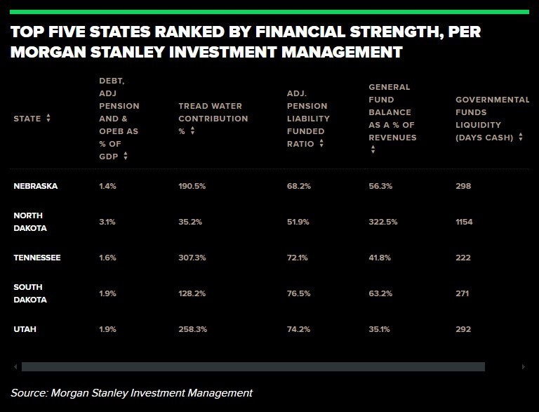 “你会注意到,即使我们将它们从1到50排名,中间的差距非常小,稍微的变化就能让你向上移动几个名次,”摩根士丹利投资管理公司市政债务部联席负责人Craig Brandon表示。“目前州政府的健康状况相当强劲。”